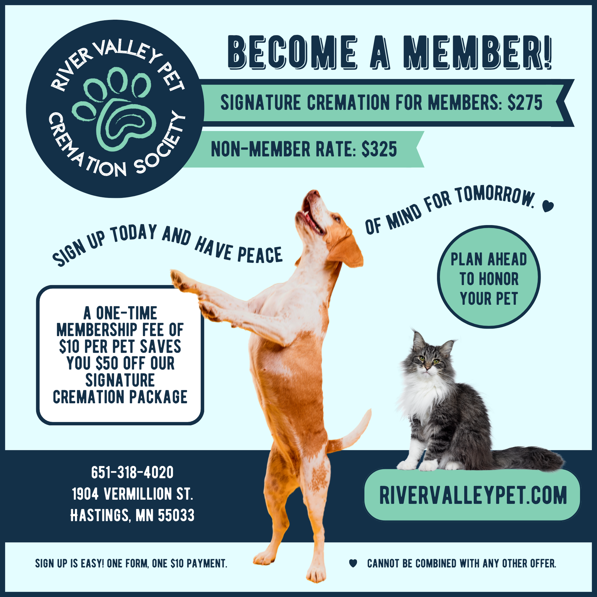 The $10 fee is due upon enrollment. Once you submit your Cremation Authorization form and payment, your pet will be a member of the River Valley Pet Cremation Society. You will receive confirmation of your membership via email.